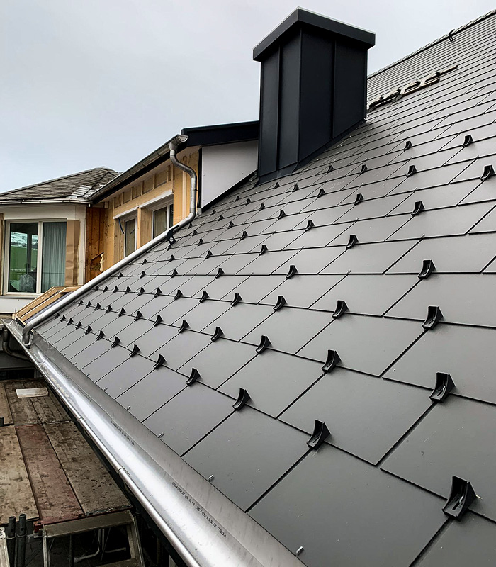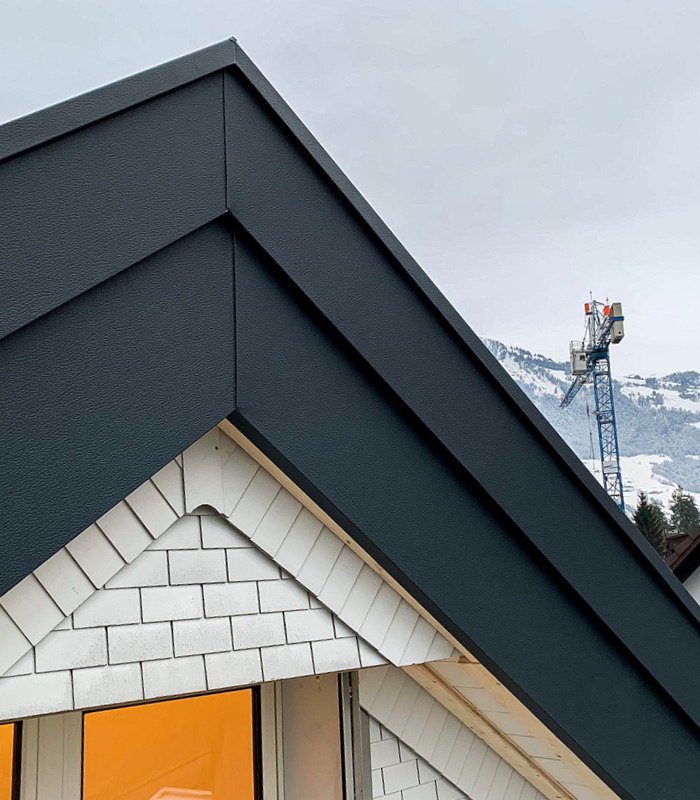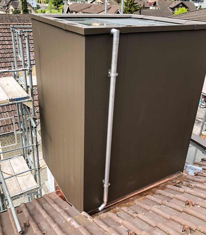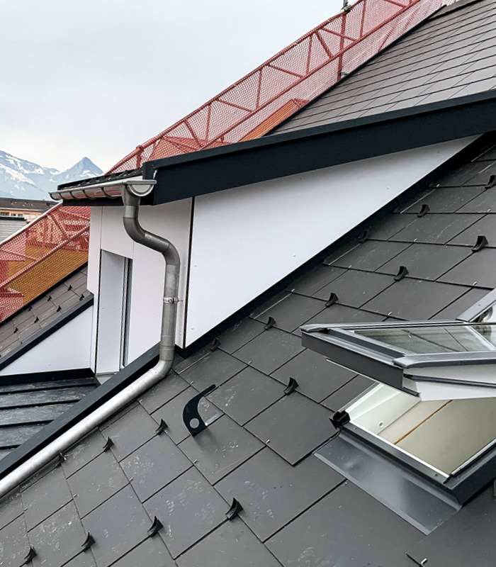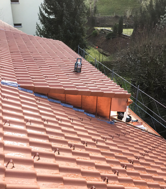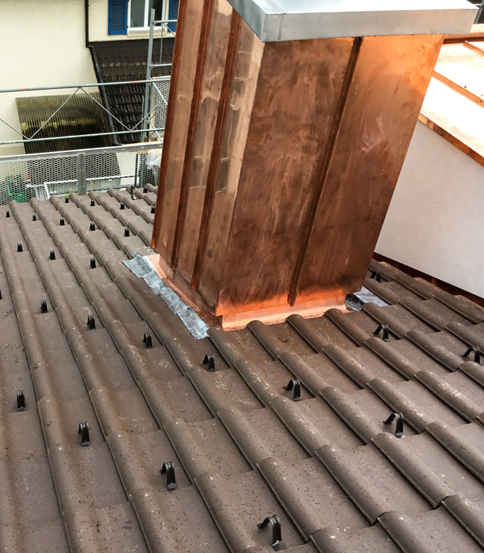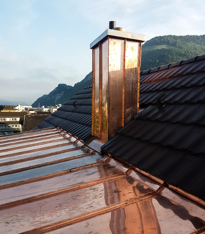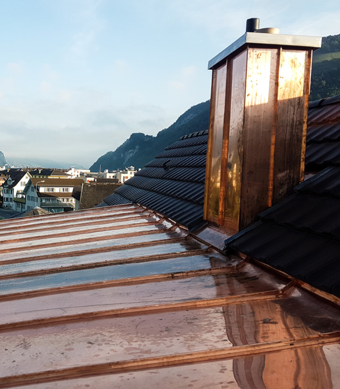 Mit dem Montieren von Falzdächern, Verkleiden von Kaminen sowie dem Anbringen von Dachrinnen, Ablaufrohren oder Blitzschutzanlagen vollenden wir Ihre Dachbauten fachkundig.