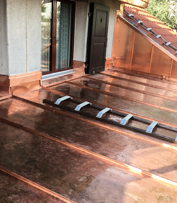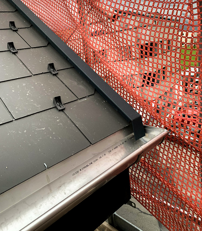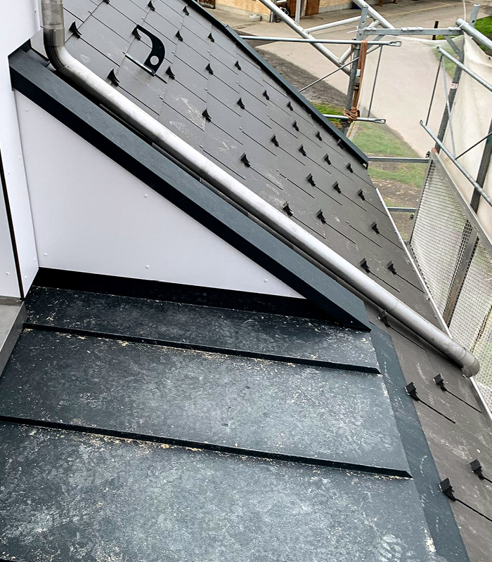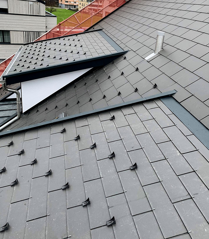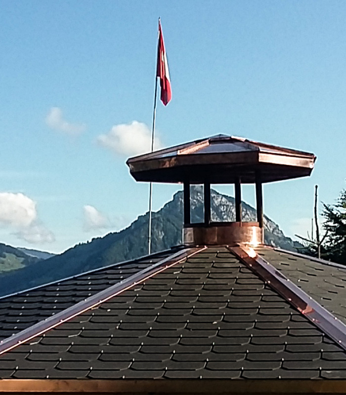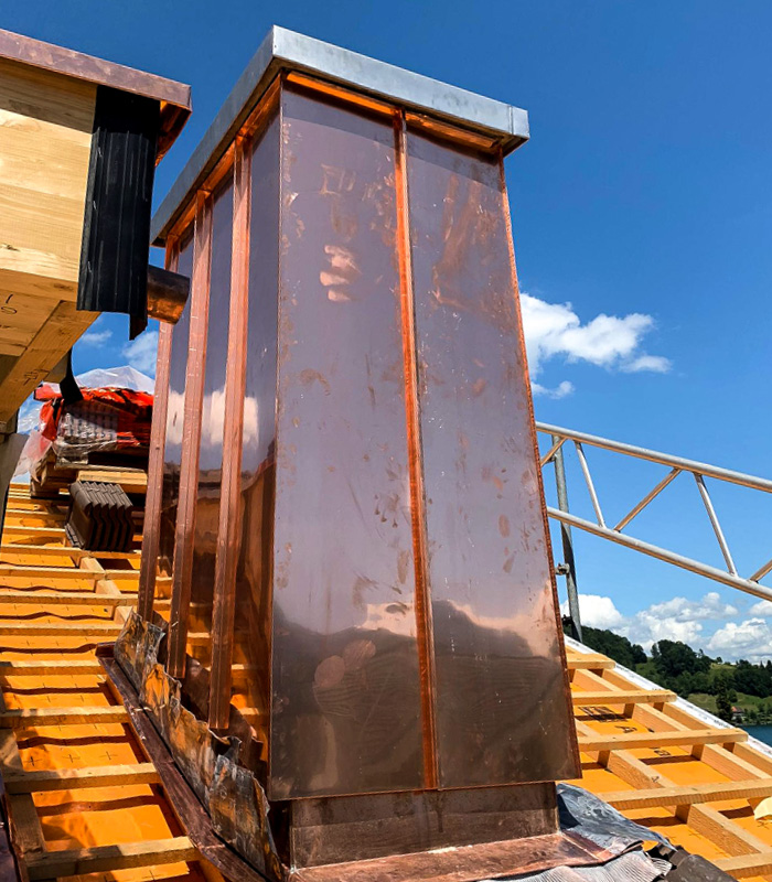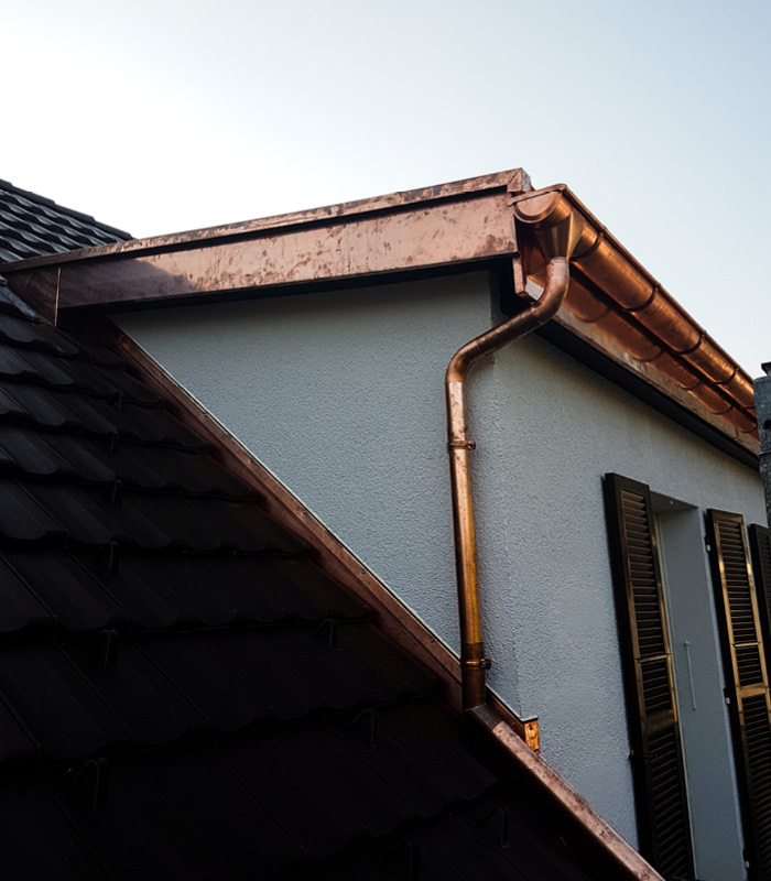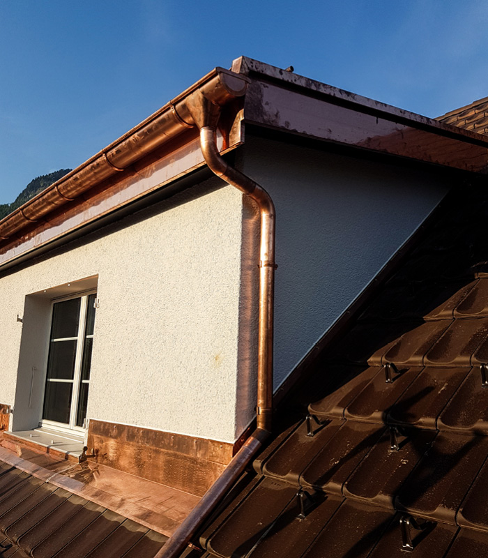 Mit dem Montieren von Falzdächern, Verkleiden von Kaminen sowie dem Anbringen von Dachrinnen, Ablaufrohren oder Blitzschutzanlagen vollenden wir Ihre Dachbauten fachkundig.